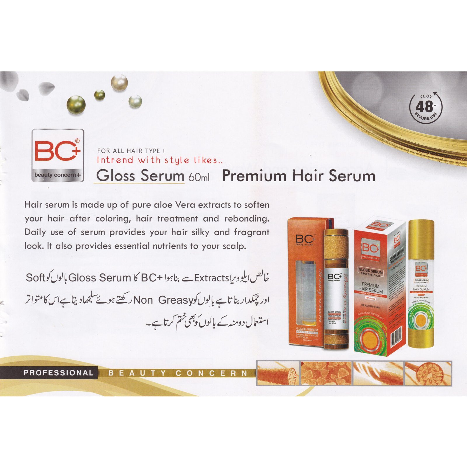 - Take a small amount of BC+ Beauty Concern Hair Gloss Serum and rub it between your palms.